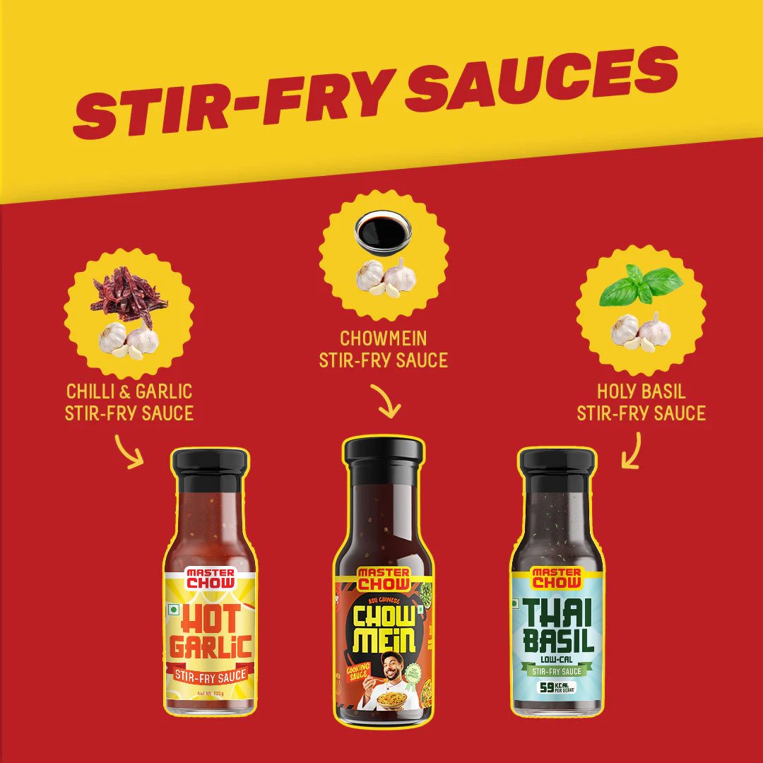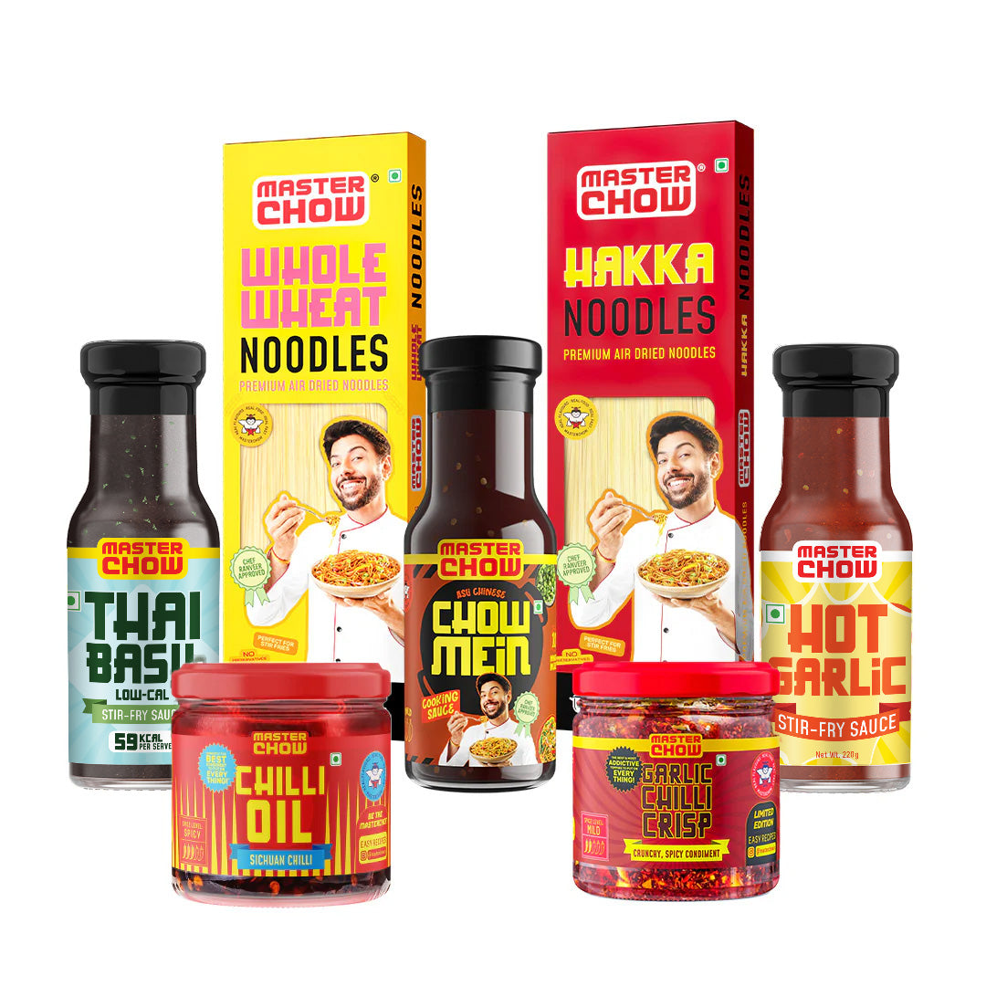 You get all the stars: Chowmein Sauce, Hot Garlic Stir-fry Sauce, Low-cal Thai Basil, and our iconic Garlic Chilli Crisp for maximum crunch. Throw in Whole Wheat + Hakka Noodles and a drizzle of our spicy Chilli Oil, and suddenly your kitchen is the hottest restaurant in town.